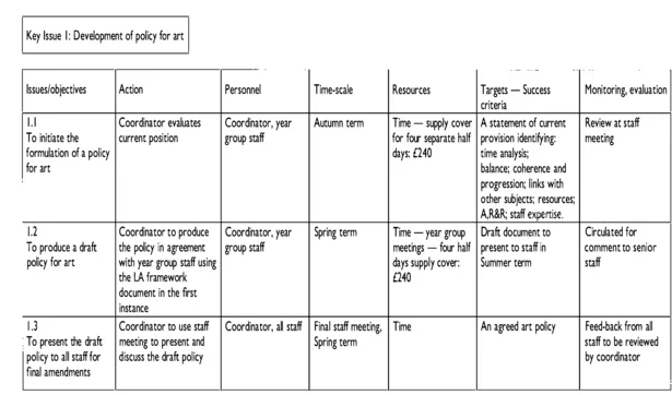 You will need to draw up an action plan whatever the particulars of your context. You have already reviewed current position, identified issues, prioritised needs and assessed the implications of change. You need to present your action plan in a clear user-friendly format and the following is an example that may help structure your proposals.