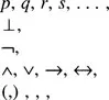 Symbols p, q, r, s, … represent an infinite number of atomic statements in the alphabet and may be seen as the building blocks of propositions. Three rows of symbols then show logical connectives that bind these atomic elements together according to the following rules: