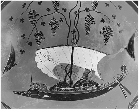 Second, at the Anthesteria it seems that Dionysos was escorted into the city in a cart shaped like a ship in a procession (depicted in vase-paintings). In the Homeric Hymn to Dionysos the god takes the form of a young man, is captured by pirates, and makes his epiphany (as a lion) on their ship, accompanied by miracles that include a spring of wine, the appearance of a vine with abundant grape-bunches along the top of the sail, and the transformation of the pirates into dolphins. A wonderful sixth-century BC vase-painting by Exekias depicts the scene (Figure 2). In the paintings of Dionysos in the ship-cart procession he is holding up a vine that stretches the length of the ship: this suggests that the procession commemorated the mythical epiphany. The arrival of Dionysos to public acclamation is also an epiphany (Chapter 4).