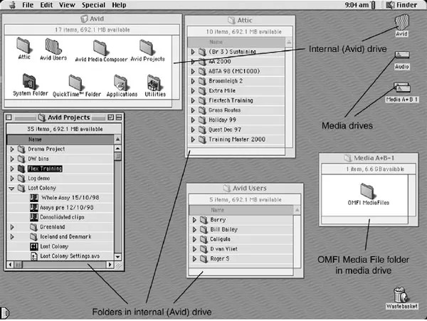 When the computer is running, the disk drives appear as icons on the right-hand side of the startup monitor (normally the left of the two on a Media Composer â see Figure Intro.3a). The top icon (normally named âAvidâ), is the internal hard disk in the Mac. This will contain a folder called âAvid Projectsâ or âComposer Projectsâ, depending on the software version. All information about the projects you work on will normally be stored in this folder. The external drives, usually with names such as âMedia 1â or âMedia Bâ, are displayed below this. At the bottom of the screen is the trash or wastebasket icon.