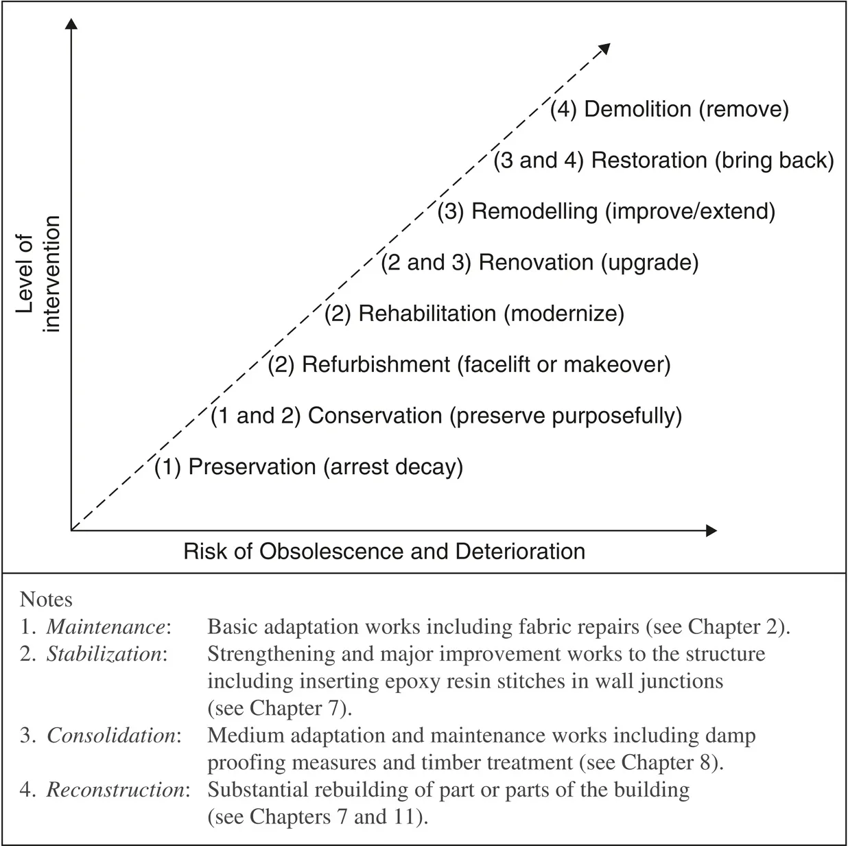As suggested in the above section the scope of adaptation works is wide and depends on the extent and purpose of the change proposed to the building. Figure 1.1 shows that they can range from basic preservation works at one end of the spectrum to almost complete reconstruction at the other (see also Figures 1.8 and 3.2, respectively for the three main branches of adaptation and for increasing intervention). In between these two extremes, in approximate ascending order are interventions such as refurbishment, rehabilitation, remodelling, renovation, retrofitting, and restoration. The Glossary at the end of the book gives brief definitions of these and other related terms.