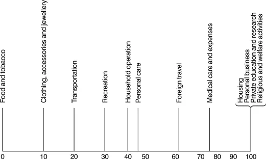 Another distinction between a good and a service, according to Rathmell, lay in the nature of the productās utility. Does the utility for the consumer lie in the physical characteristics of the product, or in the nature of the action or performance? From such tests Rathmell concluded that there were very few pure products and pure services. Economic products were to be regarded as lying along a goodsāservices continuum with pure goods at one extreme and pure services at the other, but with most of them falling between these two extremes (see Figure 1.2). Rathmell stated that some are primarily goods with service support, whereas others are primarily services with goods support. Most goods are a complex of goods and facilitating services; most services are a complex of services and facilitating goods. He applied the measuring rod of personal consumption to distinguish between goods and services. For the food and tobacco category, percentage personal consumption expenditure on the services was nil. For recreation it was 33 per cent and for religious and welfare activities, 100 per cent.