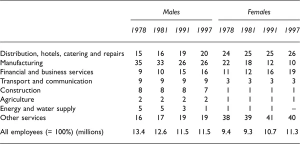 One measure of the size of the service sector in the economy is the number of people employed relative to other sectors. Table 1.1 shows the number of employees in various industries in the UK. Since 1978 there has been a switch among both male and female employees away from manufacturing towards the service sector: 35 per cent of men and 22 per cent of women were employed in manufacturing in 1978 compared with only 26 per cent and 10 per cent respectively in 1997.