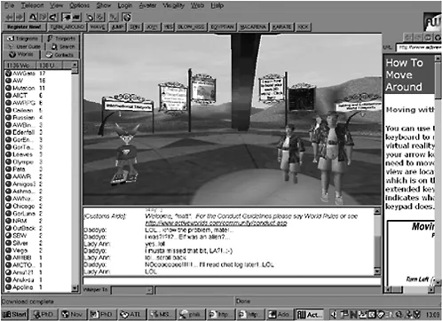 Cyberworlds is indicative of what might be termed late-modern forms of communication and interactivity. Increasingly experience is being mediated through networks (Castells 1996). The convenience and convergence of mobile communications and computer-mediated communication has seen terrestrial populations become increasingly dependent upon technology to mediate their everyday practices (Lash 2001). In particular, the Internet and its associated technologies are being employed to facilitate one-to-one and one-to-many communications on a daily basis within the arenas of social, political and economic life. Of particular interest are those groups of people who not only use new forms of technology to mediate their existing ‘real’ lives, but take a further step, using technology to create a new life. Groups of individuals are beginning to flee the physicality of their ‘real’ world, opting instead to take up residence in ‘virtual’ or online social spaces. Citizens and visitors of Cyberworlds, one of a myriad of online social spaces, often report spending over six hours a day within the ‘community’. The proliferation of ‘netizens’ has led commentators to proclaim that the Internet, and the alternative social arena it offers, acts as a ‘new community’ to replace failing social relations in the ‘real’ world (Rheingold 1993). Others have come to perceive it as the new ‘third place’, a communal space, separate from the other spaces of work and home, which individuals frequent in search of solace and friendship (Oldenburg 1999). What is evident is that a new social space has opened up where, for the most part, the constraints of everyday terrestrial life are suspended. Interactivity has taken on a markedly different form and populations are engineering alternative communities with their own social practices, rules, regulations and problems.