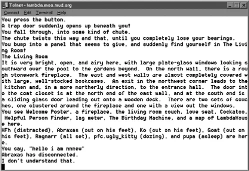 Cyberworlds is one of a handful of graphically represented three-dimensional virtual reality online social spaces that forms part of the Internet (see Figure 1.1). These online arenas can be described as second generation Multi-User Domains (MUDs); less technologically advanced methods of one-to-many text-only online communication first developed in the late 1970s3 (see Figure 1.2). MUDs were first designed by programmers as gaming arenas, much like an online version of the classic role playing game ‘Dungeons and Dragons’. In traditional MUDs, action, description and communication take place purely through text. Users have to rely on their imagination to create the environment that is being described to them. Cyberworlds takes advantage of broadband network communications, meaning much more information can be transmitted in shorter periods of time. This allows for information to be represented by more that just simple text. A graphical window allows a user to see themselves represented as an avatar, a three-dimensional persona. Via this interface users can locate each other and navigate around their three-dimensional environment. Text still functions as communication, and is essential to the maintenance of the ‘community’, but it has become relegated where visual components now represent action and description. Cyberworlds and other ‘advanced’ MUDs have grown in popularity over the last decade due to the level of social and ‘physical’ immersion they provide to the user. Essentially they are the closest domestic technology to more elaborate and expensive Virtual Reality (VR) platforms.