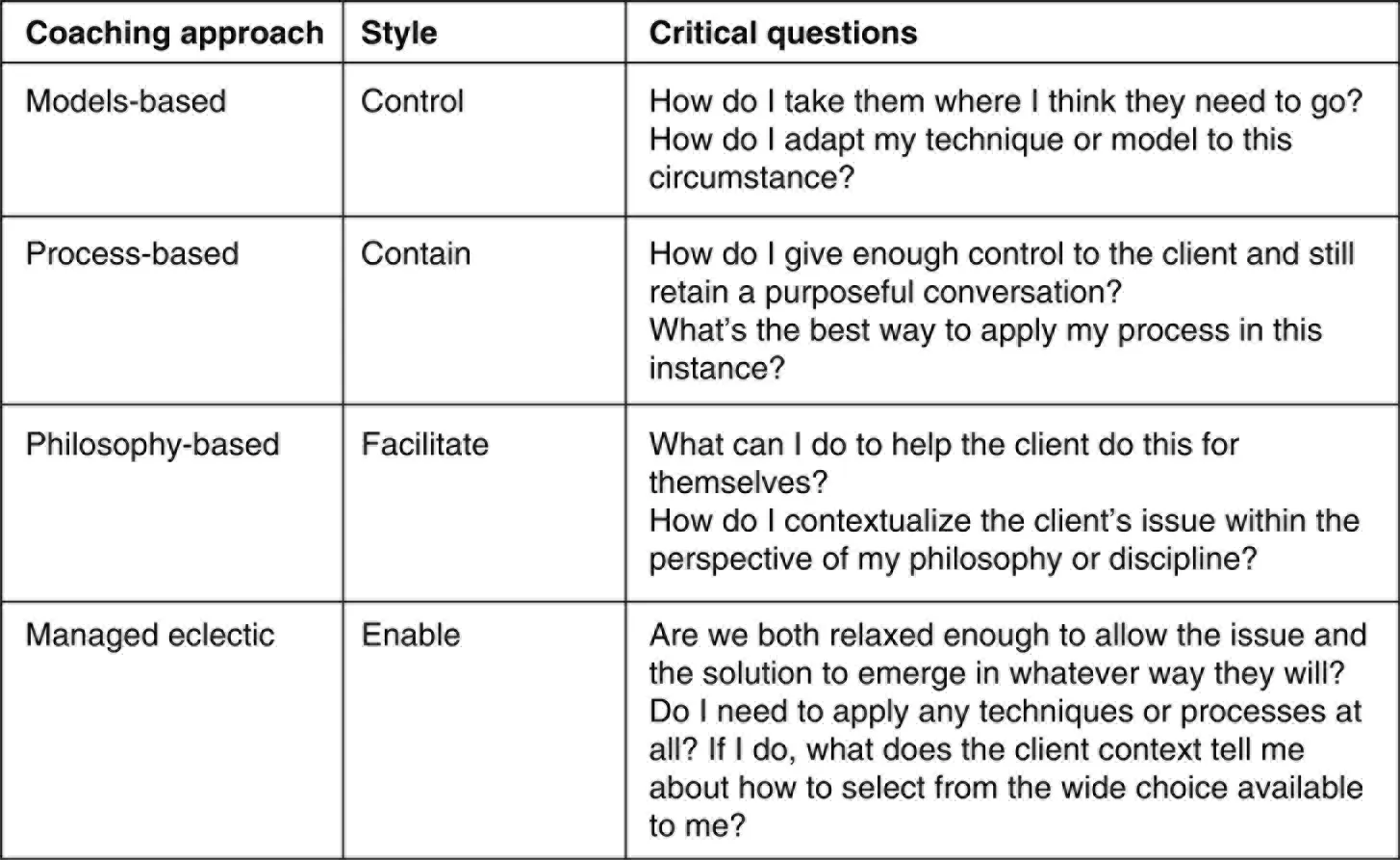 In the recent past, we have seen an encouraging growth of innovation in models, frameworks and processes. We have also observed the rise in highly confident and competent coaches of a fourth approach, which we call managed eclecticism. By this, we mean an intelligent, sensitive ability to select a broad approach, and within that approach, appropriate tools and techniques, which meet the particular needs of a particular client at a particular time. Central to this concept is that: