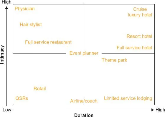 The second factor used to measure the level of customer service is duration of time spent with the customer. The customer spends a few minutes with the QSR or retail worker, while she or he spends 30 minutes or so with a physician or a tax accountant, spends hours in an airplane or full-service restaurant and perhaps days in a luxury hotel. Figure 1.1 demonstrates examples of customer interactions in terms of intimacy and duration.