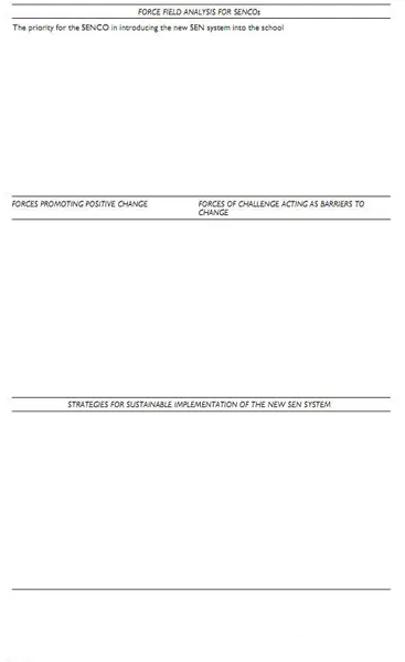 Table 1.1 provides a force field analysis template for SENCOs to use in identifying the opportunities and challenges they are likely to meet, which could be completed with their line manager.