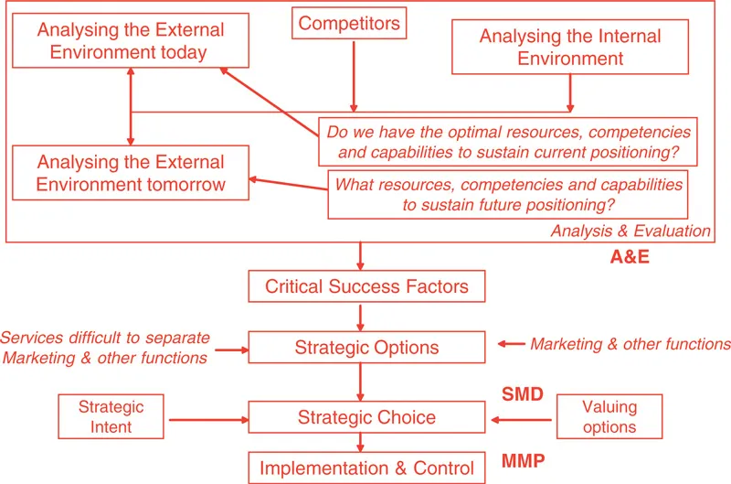 Managing the marketing planning process needs to begin with a thorough analysis of the company’s situation. The company needs to analyse its markets and the marketing environment to evaluate potential opportunities and threats. The fields of strategy and marketing are intimately linked. Certain strategy texts divide strategy formulation in companies into three distinct areas (Figure 1.6).
