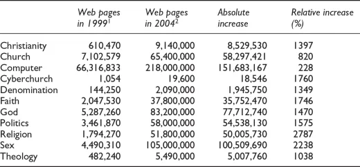 By the end of the 1990s there were more than 1.7 million web pages covering religion. In comparison there were slightly fewer than 5 million web pages containing the word sex on the Internet in 1999 (see table 1.1). By 2004, the number of religious web pages had grown considerably worldwide. There were then approximately 51 million pages on religion, 65 million web pages dealing with churches, and 83 million web pages containing the word God. As shown in table 1.1, at the same time there were 218 million, 105 million, and 58 million Internet pages containing the words computer, sex and politics, respectively.