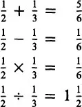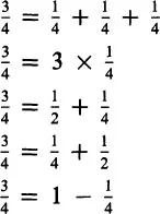 the column of number sentences was taken for granted because this is what the author intended, as was the case for the bar of chocolate with six parts. The same can be claimed for the symbolic building blocks used to express both fractions and operations. Are we to suppose, for instance, that the symbols for both numbers and operations for fractions have the same meaning as they have in the context of natural numbers? When children treat them that way, like