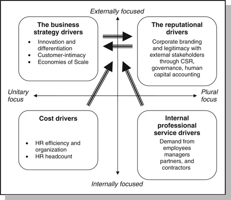 The contemporary human resource (HR) function in for-profit and not-for-profit organizations faces a number of competing challenges, so creating ambiguities and tensions in what it delivers, how it delivers, how effectively it delivers, and to whom it delivers (Ulrich and Brockbank, 2005; Huselid et al., 2005; Paauwe, 2004). The drivers of HR have traditionally been described in three-fold terms (Lepak and Snell, 1998):