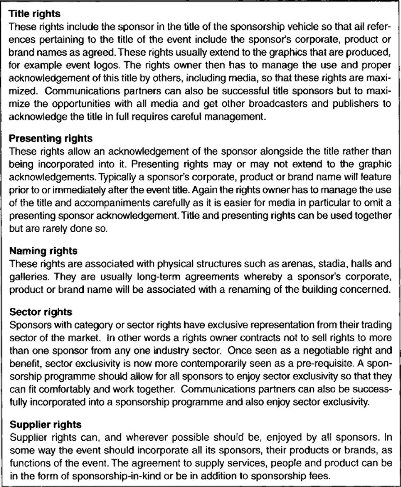 Chapter 4 considers the recruitment of sponsors with tailored and bespoke rights in an approach that seeks to identify and satisfy sponsors needs. Types of rights are discussed here and Chapter 5 continues this discussion by considering the use of endorsement.