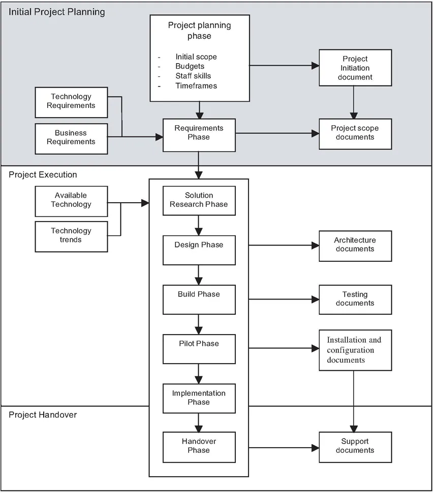 Therefore, the project structure should include a set of critical elements that govern the lifecycle of the project and its resulting outcomes. These elements follow the project from its inception to completion, and include the initial project planning, the requirements phase, the solution research phase, the design phase, the build phase, the pilot phase, the implementation phase and the project handover phase. Each phase should be completed with a corresponding set of documents that detail the information gathered in each phase, and the outputs each phase produced.