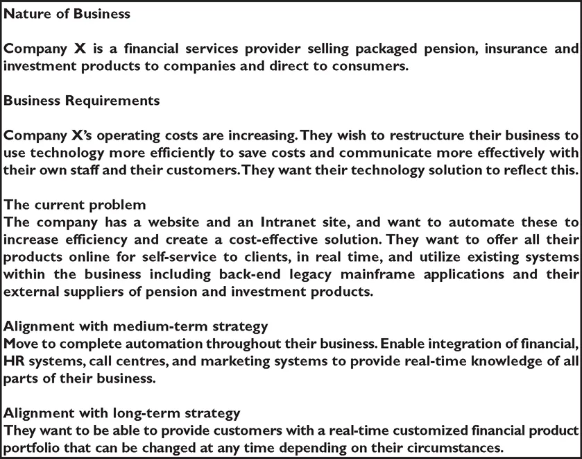 The statement of the business problems should include the nature of the business, the challenges facing it, and what business problems the technology is required to solve. It should also incorporate statements of the medium-term and long-term strategic views of business and technology needs. This ensures that all proposed solutions are aligned with medium-term and long-term plans, thus preventing selection of temporary solutions that will be discarded in future. The statement of the business problem should be expressed in a very simple and clear form, as shown in Figure 1.2.