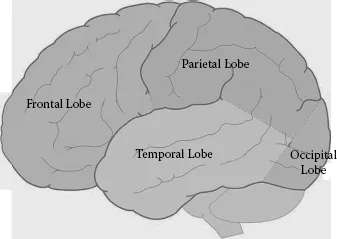 From the perspective of gross neuroanatomy, the nervous system can be divided into the central nervous system (CNS), consisting of the brain and spinal cord, and the peripheral nervous system (PNS), consisting of the nerves running to and from the spinal cord and periphery (i.e., muscle). Within the CNS, brain functions may be further organized into anterior–posterior or left–right dimensions. At this level, motor functions are typically attributed to anterior regions, while sensory processes are attributed to posterior regions. Cortical representation of the musculoskeletal system is bilateral. That is, sensory-motor functions of the left side of the body are regulated, at least at the cortical level, by the contralateral or right cerebral cortex, whereas sensory-motor functions of the right side of the body are regulated by the left cerebral cortex. This lateralization is well preserved throughout the cortex and spinal cord. Figure 1.2 shows the four main lobes of the left cerebral cortex including the frontal, parietal, temporal, and occipital cortices. Demarcation boundaries are based on Brodmann’s cytoarchitectonic maps (see Figure 1.4 later in the chapter)