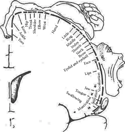 Another approach to understanding the functional organization of the CNS is based on the principle that the representation throughout the CNS is topographically organized. That is, the brain’s functional organization for a given body area (e.g., the hand) is represented by a spatial map that is preserved throughout the brain’s vertical hierarchy from the cortex through the basal ganglia and the brain stem and into the spinal column. This topographic representation generally holds that representation of lower extremities is topographically represented toward midline regions of the brain and, as we move from midline to lateral regions of the brain, representation follows from upper extremities to head and face, respectively. This scheme is commonly portrayed as a homunculus, or a representation of an anatomically deformed human being mapped onto the brain surface. Such a homunculus is depicted in Figure 1.3.