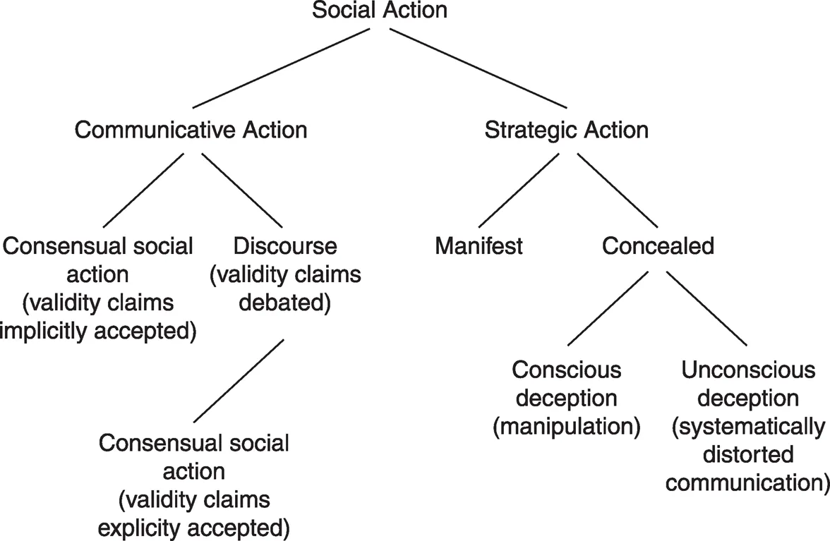Communicative action exists to foster understanding and the purpose of strategic action is to pursue and attain goals. Figure 1.1 presents these modes of social action. Where mutual understanding exists, actors have reached a background consensus. Where there are agreements to be reached, actors may adopt manifest forms of strategic action to influence each other or rely on concealed actions to manipulate or deceive. Systematically distorted communication consists in false understandings or misleading self-understandings that stem from the unconscious repression of conflict. Analyses of such situations can offer insights into deep conflicts (Habermas 1984), revealing how actors are engaged in practices that are not in their best interests (Braaten 1991).
