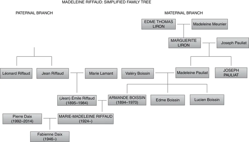 In his Philosophical Investigations Wittgenstein wrote about how seeing connections between family members by identifying repeat features serves as a model for the way in which human understanding works as a whole.5 Perspicuous understanding, âthe kind of understanding that consists in âseeing connectionsââ, is undoubtedly at work in the genre of biography that presents an initial picture of a person through their âconnectionsâ with others.6 In Riffaudâs case, her âperspicuous understandingâ of her connection to Liron has meant that she has been able to link her family story to the story of her country, making out of both of them a narrative of intergenerational legacies and inherited features. The simplified family tree below shows the line of inheritance from Liron through to Riffaud, indicating in capitals those who have carried the encoded family saga that is at the heart of Riffaudâs views of personal and national history.