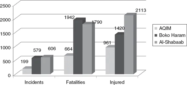While the selection of these problems and challenges represents the obvious security matters facing the continent today, this chapter focuses largely on the issue of terrorism, pointing out, where necessary, the connections between terrorism and some of the security challenges identified above. The chapter allays the current problems and high-risk areas of terrorism, and offers counterterrorism approaches that may help to manage the situation. Noting that no nation is immune from the act of terror, it goes without saying that the safety and prevention of domestic mayhem ought to be part of the agenda of any government. In order to make the discussion broadly accessible, this chapter provides a brief outline of what constitutes terrorism; some figures and tables below help to illustrate the problem.