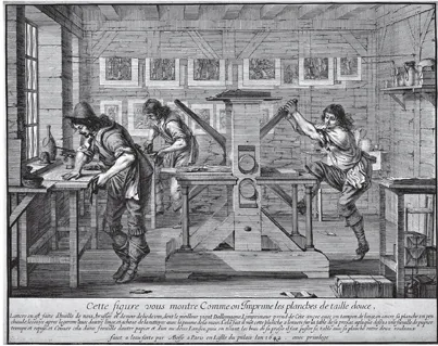In terms of doing justice to the overall significance of early printed images, matters have been complicated by the extent to which these fall into two main types, namely the woodblock and the intaglio, which have tended to be studied separately. There is a certain appropriateness to this insofar as they were executed and printed using different techniques and processes, thus entailing a different relationship with printed texts. While woodblocks involved the production of a raised surface which could be inked and printed on the same press as type, engravings and etchings involved the reverse process, with the design being incised on a metal plate from the surface of which the ink was wiped prior to printing, meaning that a different type of press, the rolling press, was required to produce impressions from it.5 The latter process is classically represented in Abraham Bosseâs famous 1642 etching of a printmakerâs shop in which workmen respectively ink the plate, wipe it and put it on the press. (Fig. 1.2) Yet even if this distinction explains why study of the products of the two techniques were often studied separately in the past, it only partly explains the extent to which such studies have remained distinct even in more recent times, and to understand this broader contrasts in scholarly preoccupations need to be invoked.