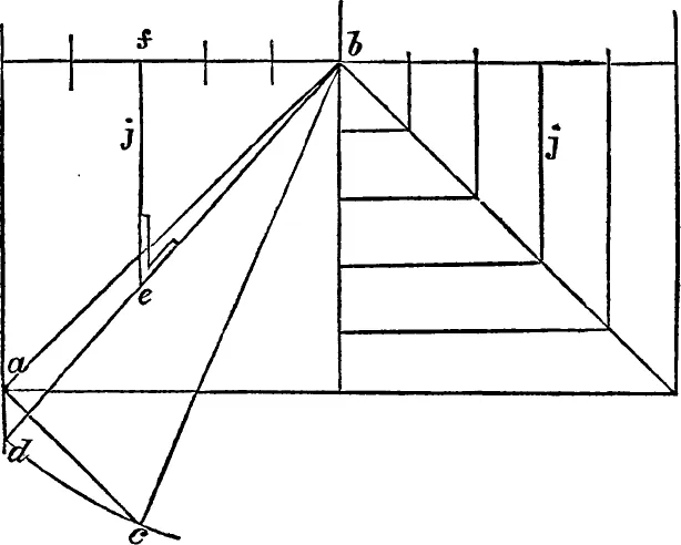 The length of all the jacks is found in the same way, by extending them to meet the line h. The down bevel of the jacks is the same as that of the common rafter at e.