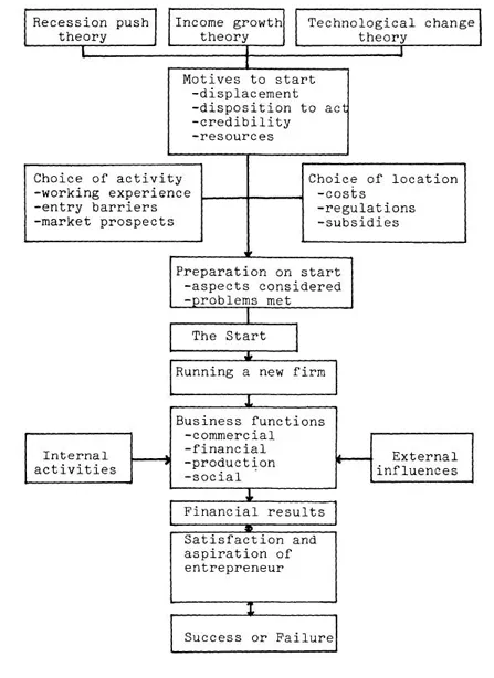 Perhaps the most obvious starting-point for considering new enterprise creation and the stimulation of entrepreneurship is the question, why does someone set up his own business, despite all the risks of such a venture? Some interesting ideas here can be derived from Shapero (1983). He distinguishes four main motives which can stimulate an individual to start a firm. The first of these is called the displacement factor. This usually explains the precise timing of business formation. Sometimes the firm founder has very little choice in this respect. Many refugees, for example, start their own firm because they have no other obvious way to survive. In the same way, longterm unemployment, or the threat of it, can stimulate people to start up in business for themselves. To Shapero such negative firm formation motives are very important: āthreat works more than incentiveā. Of course there are also more positive motives for starting a new firm. It may be that these positive motives are more important than negative stimuli in our West European welfare states. Examples of positive factors are the desire to be recognised as a craftsman, the wish to use oneās capacities to the full, the ambition to be oneās own boss, and the urge to become rich.