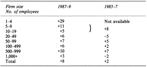 Peter Johnson (1989) has also looked at employment change according to size, but only for UK manufacturing establishments. He shows that, whilst there has been an increase in the percentage of employment in establishments with under 200 workers, a substantial proportion of this is because of former large firms which have contracted in size. The increase in ...