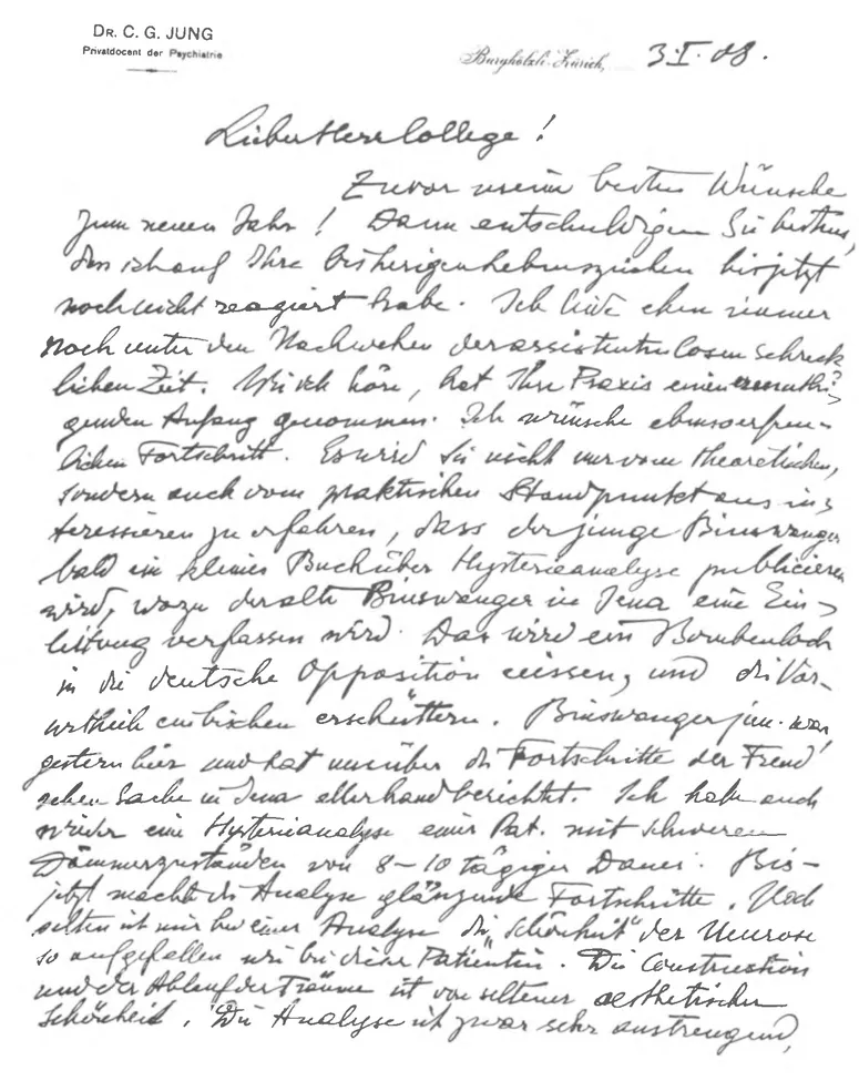The Freud discussion in Berlin makes dismal reading—they have even filched the method from Breuer-Freud.3 It is nothing but a ridiculous farce and a piece of impudent knavery besides for Bezzola4 to assert that he has a new method. Freud has done all that already, only with less masquerading and other suggestive humbug, but more intelligence. It is depressing that Juliusburger,5 who is obviously an honest man, didn't spot the trick. Can't you instil a little insight into him? Liepmann's6 attitude is—well, what can one call it? Maybe you have a good Berlin expression for this, for there must be other people of that ilk there. Freud was naturally moved by this discussion—he did get mentioned and a crumb even fell to him from the Lord's table. A man of Freud's modest achievements can wax fat on that.