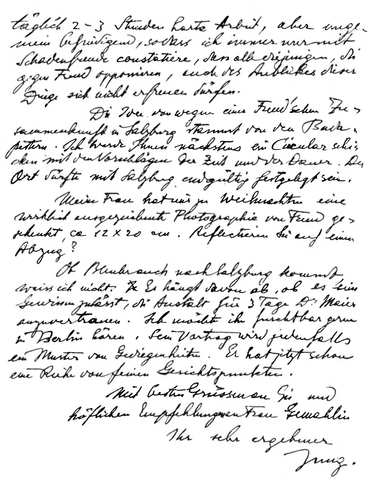 The idea of a Freudian meeting in Salzburg4 originates with the Budapestians. Shortly I will send you a circular with suggestions as to the date and duration. The place should definitely be Salzburg.