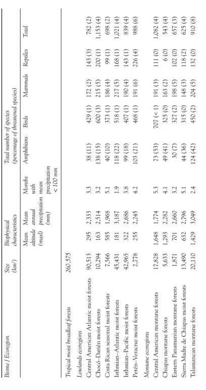 Table 1.2 Biophisical characterization and species richness of ecoregions in Central America