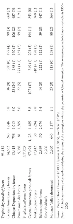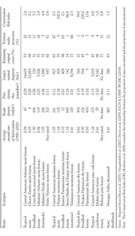 This chapter describes the terrestrial ecoregions of Central America and its nested biomes based on the analysis framework proposed by Dinerstein et al. (1995) for setting priorities of conservation. Ecoregions provide a conceptual framework for the identification of representative habitats and serves as a tool to compare areas with different biodiversity features, status of their natural habitats and degree of protection (Olson et al. 2001). The description of their biotic characteristics, landscape context, main threats to loss of biodiversity and degradation caused by human activities and conservation status is based on the available literature but also on spatial analysis at regional scale.