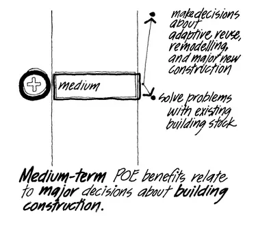 Over the medium term, POEs can provide the justification and information base for adaptive reuse, remodeling, or major construction in order to resolve problems that have been identified in existing buildings. Recycling old loft buildings into apartments, installing new telecommunications wiring, or building additions to accommodate organizations' changing space needs are examples.