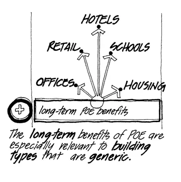 The time frame for long-term benefits to come to fruition can range from three to ten years. As was stated earlier, this benefit of POEs is particularly relevant to generic building types, such as hotels, office buildings, schools, retail facilities, and housing.