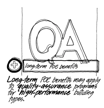 Another long-term benefit of POE is its application to quality assurance (QA). This area of concern is of increasing importance in the medical field, where performance standards have been established, for instance, in the area of laboratory testing. These standards provide for the appropriate levels of accuracy of testing procedures and must be carefully followed. Quality assurance requires some means of indicating quality and performance, action taken on problems identified by these indicators, and accurate recordkeeping. QA, adapted to the building industry, can be implemented by employing the POE process model presented in chapter 4.