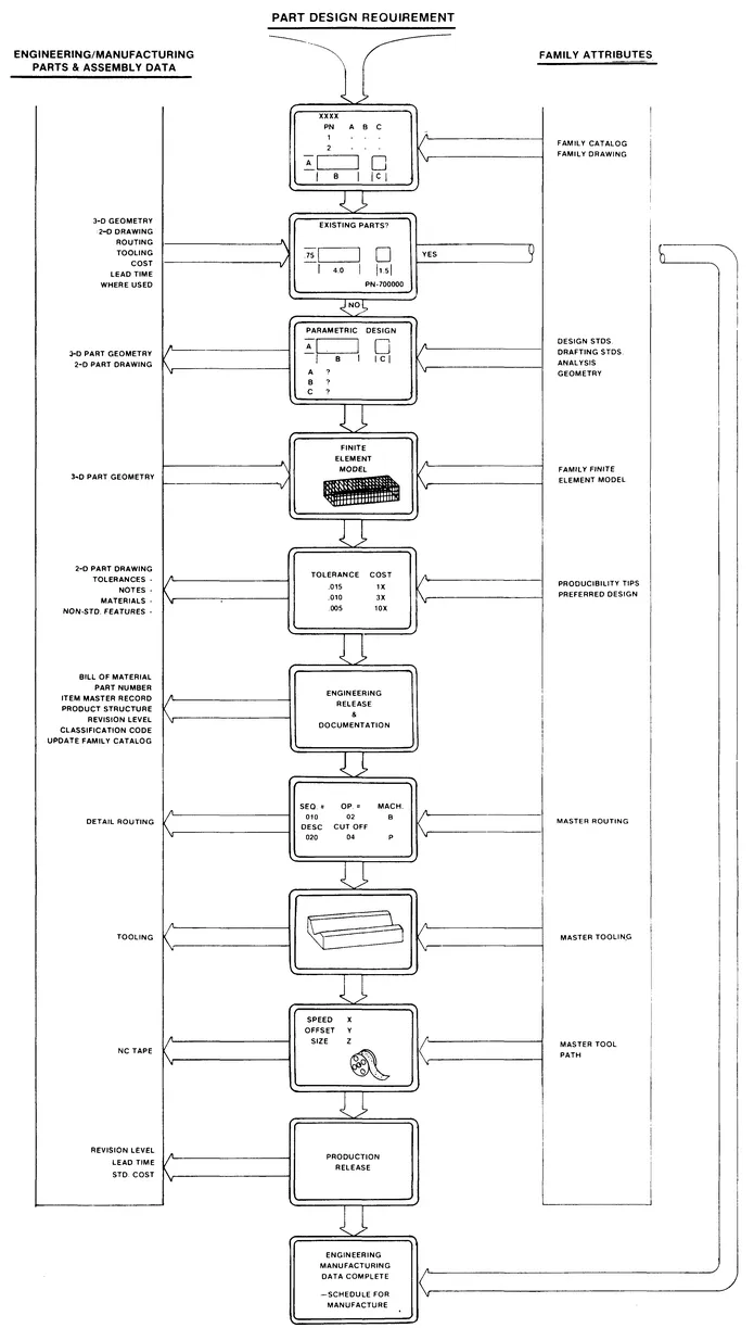 We have already described how the computer has been used in design but the results have been manually transferred to other media such as an engineering drawing. Perhaps the simplest answer to the resistance to mechanization can be found in the attitudes, the education, and the objectives of the engineer and designer. Engineers design "things." These "things" do not portray "flow." The design is an entity, not a portion of a stream. The result of a design is a picture, not a piece of paper. The change in a design is a new picture, not an engineering change notice. The parts composing the design are additional drawings, not physical parts made with corresponding tools, work centers, and inventories.