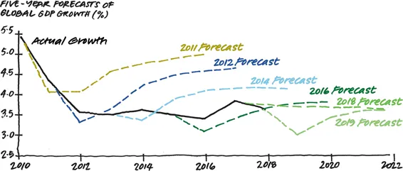 These projections are from the fall IMF outlooks of each year; 2020 projections are not shown due to impact from Covid-19.Source:āA Bad Time to Be Average,ā by Hans-Paul Bürkner, Martin Reeves, Hen Lotan, and Kevin Whitaker, July 22, 2019. Used by permission of the BCG Henderson Institute, a division of Boston Consulting Group. All rights reserved.
