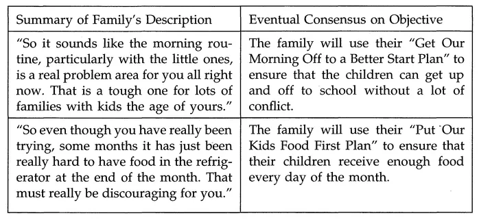 As discussed in Chapter 6, building consensus around family (and individual) objectives must begin with the first summary statements of the caseworker. As the caseworker tracks the sequence of family events that occurred when someone lost control (e.g., abuse) or when someone didn't adequately provide (e.g., neglect), the family's story must be responded to in such a way that problems are increasingly framed as developmental tasks. Statements such as, "So the morning routine with the little ones is a real problem area for you right now," or "So even though you have really been trying, having food in the refrigerator at the end of the month has really been difficult," allow objectives to be formalized around developmental tasks. Figure 7-1 illustrates how summary statements regarding family interaction can eventually lead to consensus around family-level objectives.