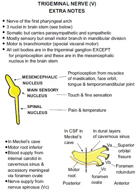 - The sensory nucleus is primarily for touch and temperature, present in the pons.