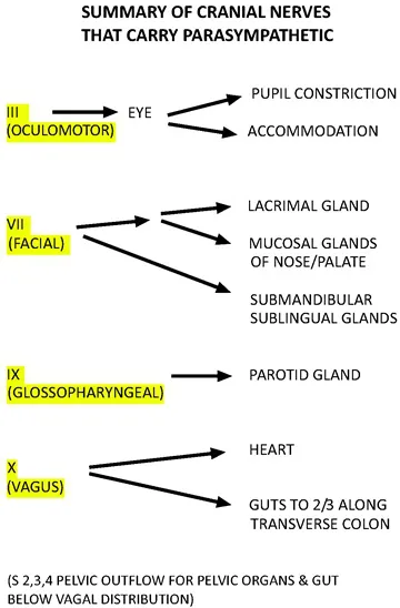 - Facial nerve (pterygopalatine ganglion, submandibular ganglion)