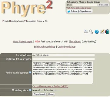 Phyre2 server predicts the 3D structure of target protein sequence by using homology modeling approach. It has been ranked amongst one of the best systems of its kind for the last four years as judged by the biannual Critical Assessment of Structure Prediction (CASP) meetings (Lawrence et al., 2011).