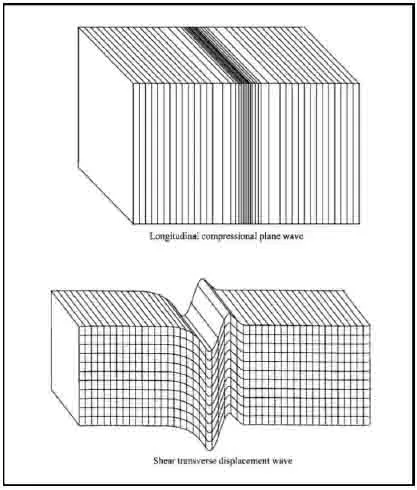 Two examples of acoustic pulses, travelling from left to right. The media on either side of the wave pulse is in the equilibrium position: that the right of the pulse has not yet been disturbed, and that on the left has returned to equilibrium after the oscillations associated with the pulse have damped down. The depicted waves are the longitudinal (compressional) plane wave and the shear (transverse displacement) plane wave. Modified From: Timothy G. Leighton “What is ultrasound?” Progress in Biophysics and Molecular Biology 93 (2007) 3–83.