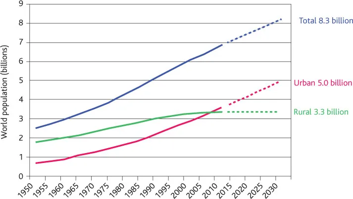 If we turn our attention to the relatively near future â the period between now and 2030 â the world population is set to rise from just over 7.0 billion in 2011 to around 8.3 billion in 2030 â see Figure 2.1. By then in the region of 5 billion people (or around 60 per cent of the worldâs population) will live in urban areas. This is a staggering increase in the world urban population in a comparatively short time span. Consider this. The population of Greater London is around eight million. This means that an urban expansion of 1.4 billion (from 3.6 to 5.0) is equivalent to adding over 175 cities the size of London to the global urban landscape in less than twenty years. Except, as we shall see, they wonât look that much like London. In marked contrast to spiralling urban growth, the world rural population is projected, as shown in Figure 2.1, to level out and, indeed, to start decreasing in the period from around 2020.