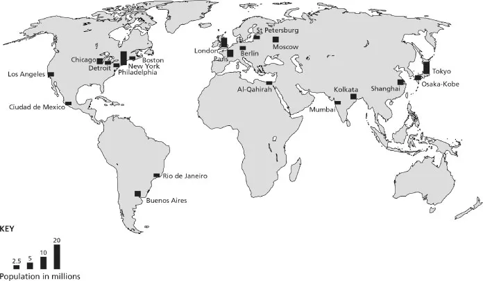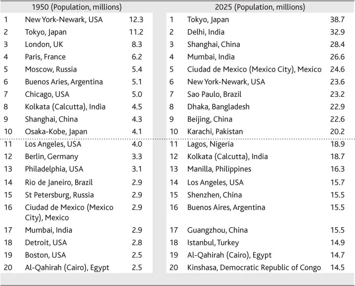 Table 2.1 lists the twenty largest cities in the world in 1950 and 2025. Figures 2.2 and 2.3 show where these cities are located, and the graphics on the maps give a visual indication of the size of these really big cities. New York City was the largest city in the world in 1950 with a population of 12.3 million, and five other US cities are also listed in the 1950 âtop twentyâ (Chicago, Los Angeles, Philadelphia, Detroit and Boston). In 1950 Europe had three cities listed (London, Paris, Berlin) and Russia two (Moscow and St Petersburg) â see Figure 2.2. Spring forward to 2025 and, while the US still has two cities listed (New York and Los Angeles), Europe and Russia do not even feature. As Table 2.1 shows almost all of the âtop twentyâ megacities in 2025 are in developing countries.