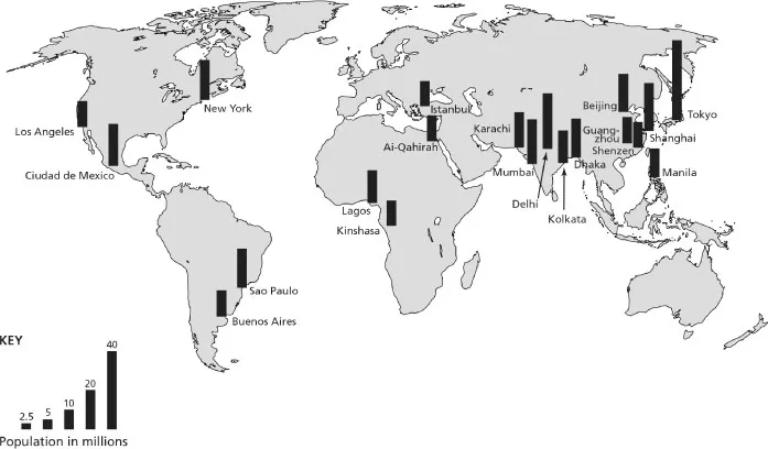 As explained in Chapter 1 place matters a great deal; moreover places are very different. It follows that we must guard against generalising too freely about âglobal urbanisationâ. However, accepting this caveat, we can identify a number of striking features about international urban trends. The first point to highlight is that urban areas are growing at a faster pace than ever before. This is because, as shown by Figure 2.1, the total world population is rising steeply and because the urban share of the world population is also increasing. Second, todayâs cities are bigger than ever before. For example, in 1950 the world had two megacities, cities with a population of over ten million â New York and Tokyo. Now it has over twenty. Third, the distribution of the urban population is shifting dramatically. The bulk of urban growth is now taking place in the developing world. I offer a table and a couple of world maps to illustrate aspects of these dynamics.