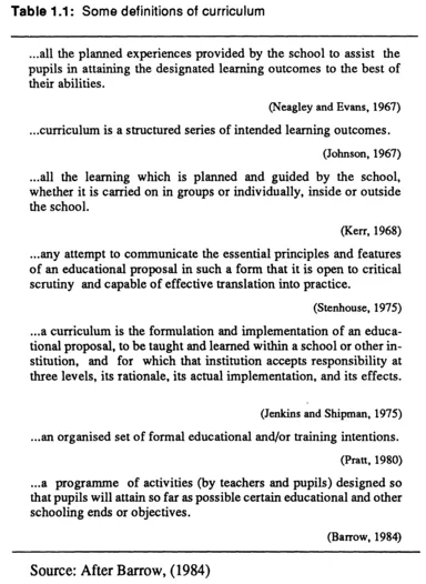 One way some curricularists have approached this task is simply to offer a definition of curriculum. By defining what they take the term to mean, they allow their readers to evaluate usefully their subsequent analyses for their logical consistency with the definition. But by doing this they are really only begging the question โ what do we mean by curriculum? โ rather than supplying a resolution. I will not be concerned to contest particular definitions here, but rather to synthesise its broad characteristics from the many ways in which curriculum has been defined.