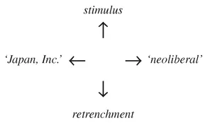 These downs and ups of the business cycle were connected to swings in policy, seen conspicuously in two dimensions. First, there was a stop-go cycle of fiscal retrenchment versus Keynesian stimulus. Second, a series of drives for 'neoliberal' regulatory reform along Anglo-US lines cycled with renewed efforts to maintain more protective 'Japan, Inc.' style arrangements (Metzler 2008). One could diagram this policy space in two dimensions as follows:1 In practice, policy combinations in the 1990s tended to cycle between the 'northwest' (stimulus/Japan, Inc.) quadrant and the 'southeast' (retrenchment/neoliberal) quadrant of this policy space.