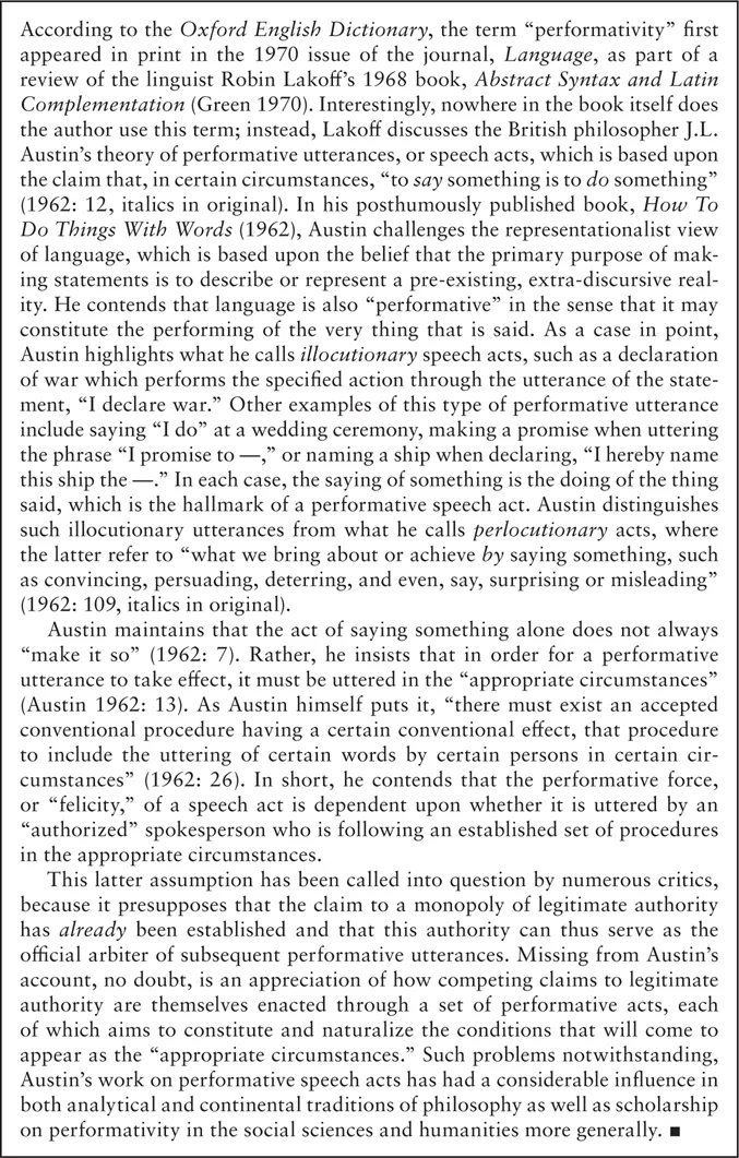 The concept of performativity entered the geographical lexicon in the 1990s as feminist geographers and queer theorists drew inspiration from Butler's (1990, 1993) provocative work on the performativity of gender norms. Yet, scholars in other fields had begun exploring the performativity of language and social life much earlier (e.g., Green 1970; Ginet 1979; Gardner 1983). These early references to the notion of performativity were direct responses to the philosopher J.L. Austin's theory of speech acts, which he developed in the 1950s as a critique of the âdescriptive fallacyâ of logical positivismâthat is, the belief that the only legitimate role of language is to describe or represent the world by means of verifiable, factual statements. Any statement that could not be verified as an accurate representation of reality, the positivists maintained, was simply nonsense that should be passed over in silence.3 One of Austin's (1962, 1979) greatest achievements was to question the representationalism that underpinned positivist philosophy by demonstrating that language is performativeâit has the potential to actually do something in the world rather than merely depict an already existing state of affairs (Figure 1.1).