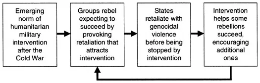 The common wisdom underlying this emerging norm is that humanitarian military intervention reduces the amount of genocide and ethnic cleansing (forced migration), which together can be labelled ‘genocidal violence’. However, this causal relationship has not been demonstrated, and there is some contrary empirical evidence and deductive logic suggesting that the intervention norm may at times actually cause genocidal violence. This is because the norm, intended as a type of insurance policy against genocidal violence, exhibits the pathology of all insurance systems by creating moral hazard that encourages risk-taking (see Figure 1). Specifically it encourages disgruntled sub-state groups to rebel because they expect intervention to protect them from genocidal retaliation by the state. Actual intervention, however, is often too late or feeble to prevent such retaliation. Thus, the norm causes some genocidal violence that otherwise would not occur. This chapter develops a theoretical framework to understand the problem; illustrates it in two cases; discusses analogous problems in economics; analyses potential remedies; and concludes by exploring the putative moral responsibility to intervene.
