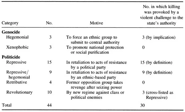 In a separate research project Helen Fein (1990) focuses exclusively on genocide, ostensibly excluding cases of pure politicide in which victims did not share common ethnicity and were targeted solely for political reasons. This confines her database for the period 1945–88 to 19 cases, which she divides into four categories, also based on the motive of the perpetrator.4 She uses different labels for categories that are quite similar to those of Harff and Gurr: their repressive category translates roughly into Fein’s ‘retributive’; revolutionary becomes ‘ideological’; xenophobic becomes ‘developmental’; and hegemonial becomes ‘despotic’. Despite this semantic difference, Fein likewise finds that genocide is usually provoked by members of a group challenging the state: “one could classify at least 11 cases [58%] as retributive genocide in which the perpetrators retaliated to a real or perceived threat by the victim to the structure of domination”. She also suggests that two of the other cases could be coded properly as retributive, which would raise the proportion in her database to 68% as well.5